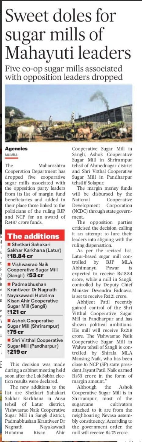 The Maharashtra Cooperation Department has dropped five cooperative sugar mills associated with the opposition party leaders from its list of margin fund beneficiaries and added those linked to the politicians of the ruling BJP and NCP for an award of ₹487 crore funds.