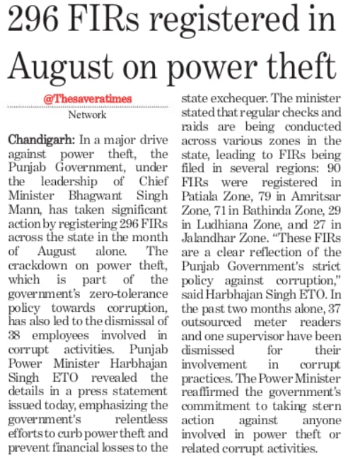 In a major drive against power theft, the Punjab government has taken significant action by registering 296 FIRs across the state in August alone.