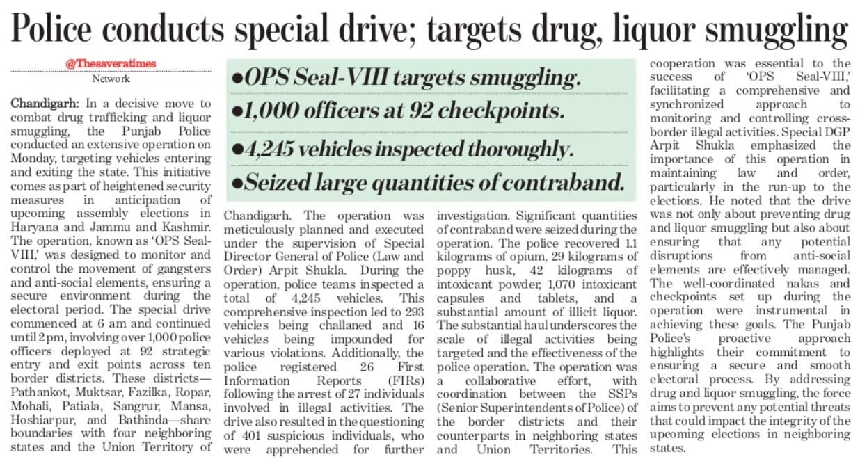The Punjab Police conducted a special drive; targeting drug and liquor smuggling ■ OPS Seal-VIII targets smuggling ■ 1,000 officers at 92 checkpoints ■ 4,245 vehicles inspected thoroughly ■ Seized large quantities of contraband