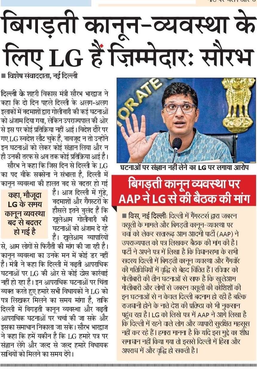 BJP's LG is responsible for the deteriorating law and order situation in Delhi