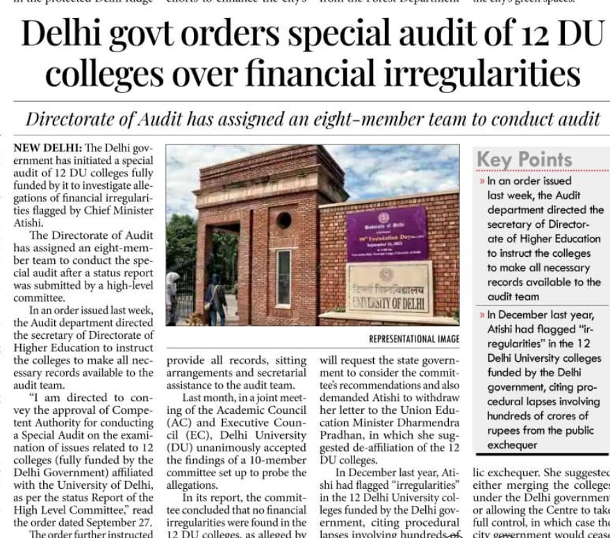Delhi govt orders special audit of 12 DU colleges over financial irregularities The Directorate of Audit has assigned an eight-member team to conduct the audit
