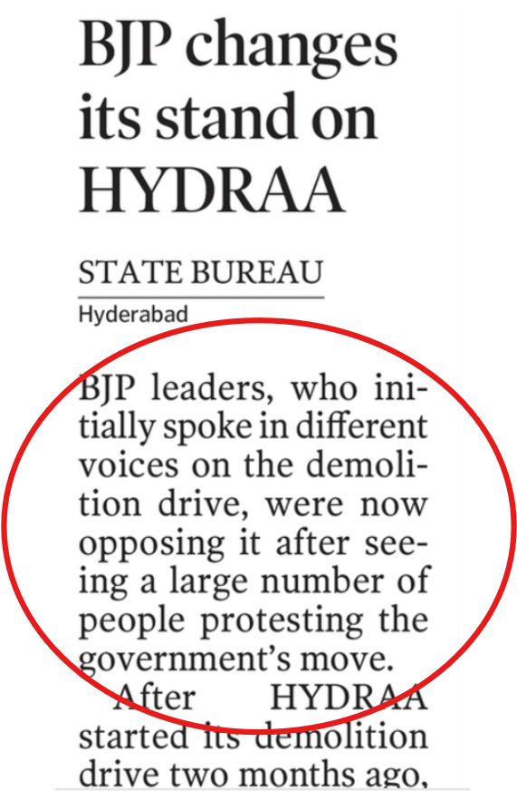 After many people opposed the Congress's demolition drive, the BJP changed its stand in Hyderabad. There is a message for Delhiites and the aggrieved in other states