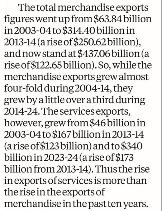 Goods export grew four times between 2004 and 2014, and barely by one-third between 2014 and 2024. For services exports, it increased 3.6 times between 2004 and 2014 while it only doubled between 2014 and 2024. So much for Make in India.