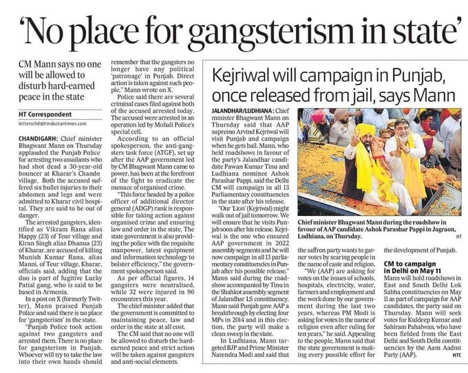 'No place for gangsterism in state' CM Mann says no one will be allowed to disturb hard-earned peace in the state Kejriwal will campaign in Punjab, once released from jail, says Mann.