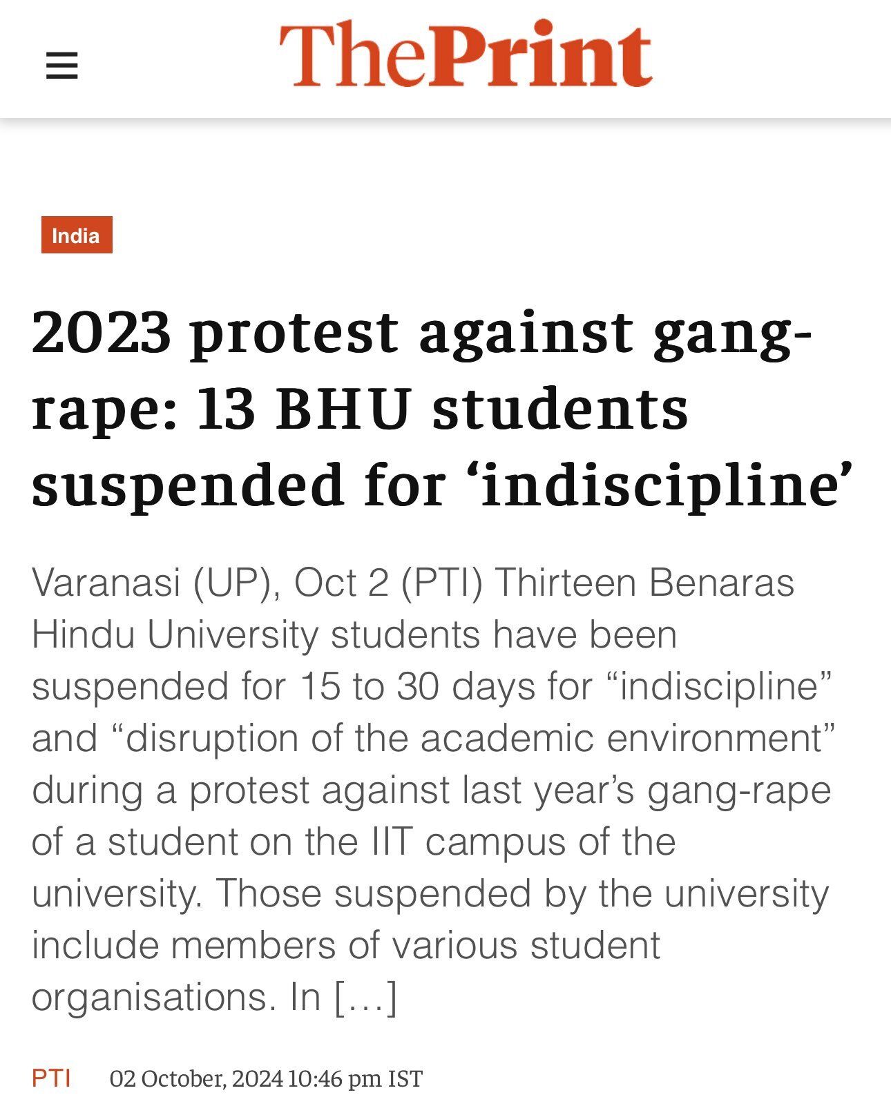 Tale of Two States & our hypocrisy… In West Bengal - Jr. Doctors managed to shake up the Mamata Banerjee Govt to the core after RG Kar Rape/Murder - people joined in the protests forcing the CM to literally plead for a way out & concede to their demands. In Uttar Pradesh - a gang-rape of a student in the prestigious IIT-BHU campus led to a massive protest - but eventually the politically connected accused got bail ….now 13 protesting students have been suspended for ‘indiscipline’