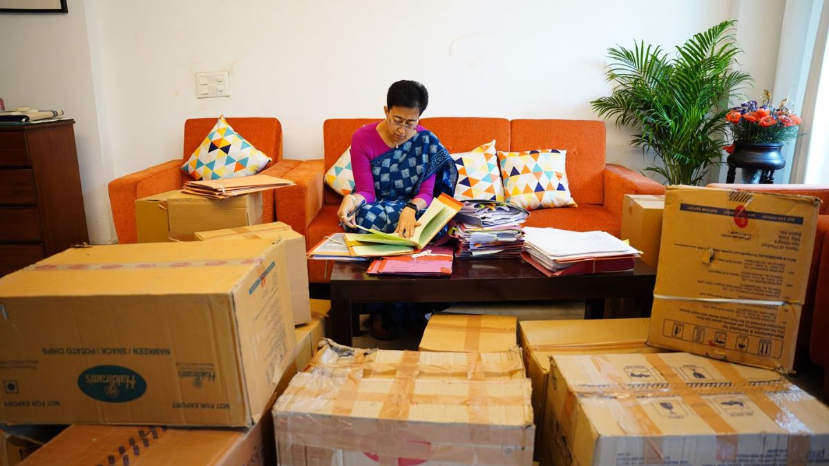 First image of Delhi CM Atishi post-sealing of her official residence. Working from her private home, with packed belongings behind her, she remains focused on serving the people of Delhi