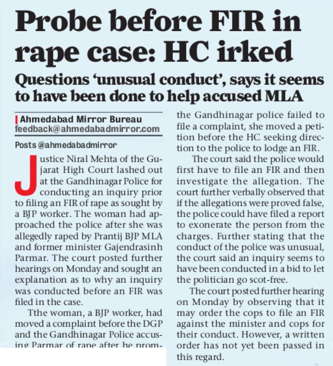 Probe before FIR in rape case: HC irked Questions the 'unusual conduct', and says it seems to have been done to help the accused Prantij (Gujarat) BJP MLA, who is also a former minister