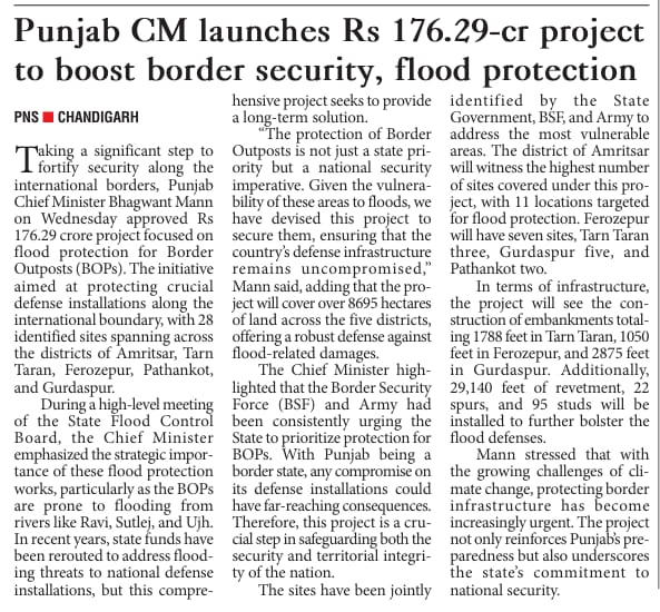 Taking a significant step to fortify security along the international borders, Punjab Chief Minister Bhagwant Mann on Wednesday approved Rs 176.29 crore project focused on flood protection for Border Outposts (BOPs).