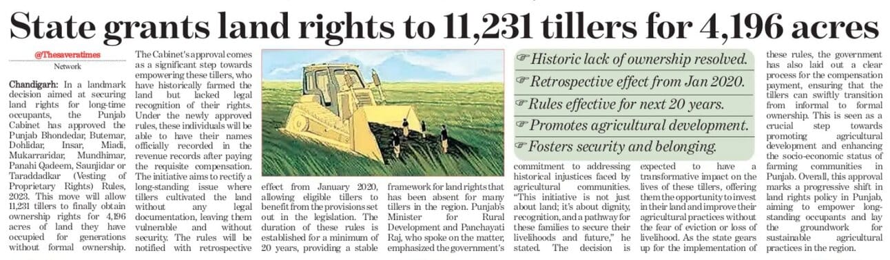 The Punjab govt has granted land rights to 11,231 tillers for 4,196 acres of land. Historic lack of ownership resolved Retrospective effect from January 2020 Rules effective for 20 years Promotes agricultural development