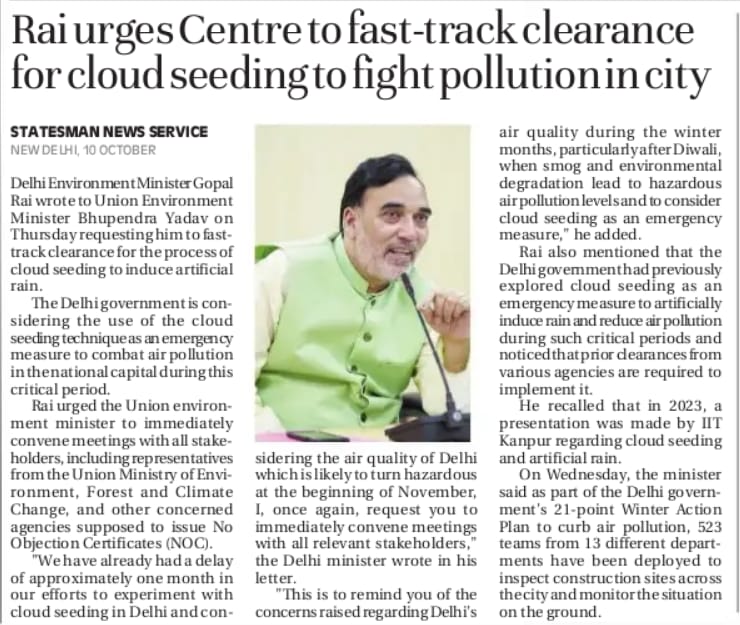 Delhi Environment minister Gopal Rai has urged the Centre to convene an urgent meeting with key stakeholders to expedite approvals for cloud seeding, an emergency measure aimed at reducing the anticipated winter pollution spike in the Capital.