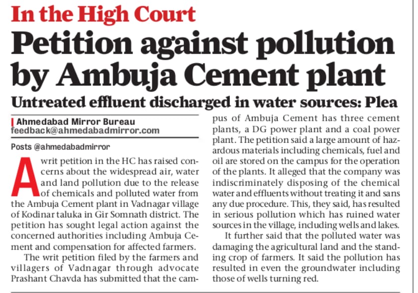 A writ petition in the HC has raised concerns about the widespread air, water and land pollution due to the release of chemicals and polluted water from the (Adani's) Ambuja Cement plant in Vadnagar