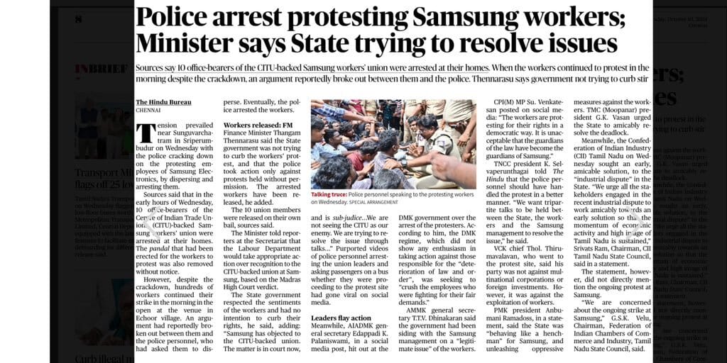 It is outrageous that the police under the DMK government arrested the striking Samsung workers and their union leaders, thus clearly taking the side of the South Korean multinational. These arrests were clearly against the striking workers’ fundamental rights guaranteed under Article 19 of the Constitution. The key demand of the striking workers is that their newly formed union Samsung India Workers’ Union (SIWU) must be recognised. The statements of the DMK Ministers that the government is not taking sides in this dispute do not wash!