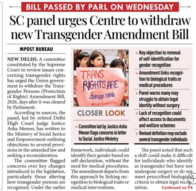 Supreme Court panel urges Centre to withdraw the new Transgender Amendment Bill.