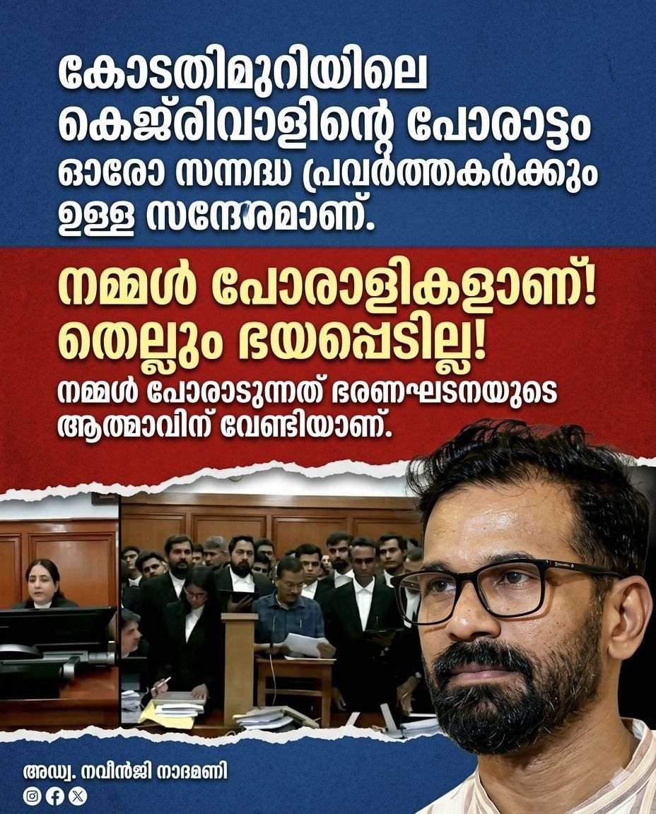 ."Kejriwal's fight in the courtroom is a message to every volunteer. We are fighters! We will not be afraid! We are fighting for the spirit of the Constitution." - Naveenji Nadamoni, AAP Kerala - From Facebook