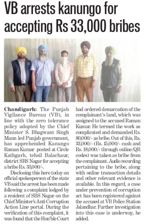 The Punjab Vigilance Bureau arrests kanungo for accepting 33,000 bribes.
