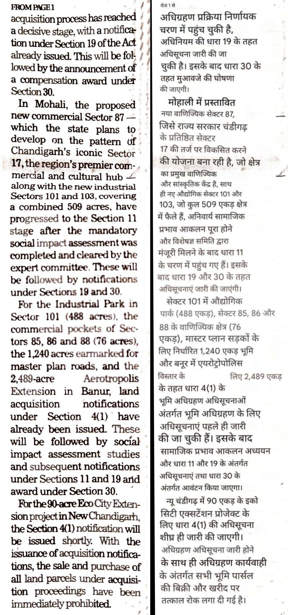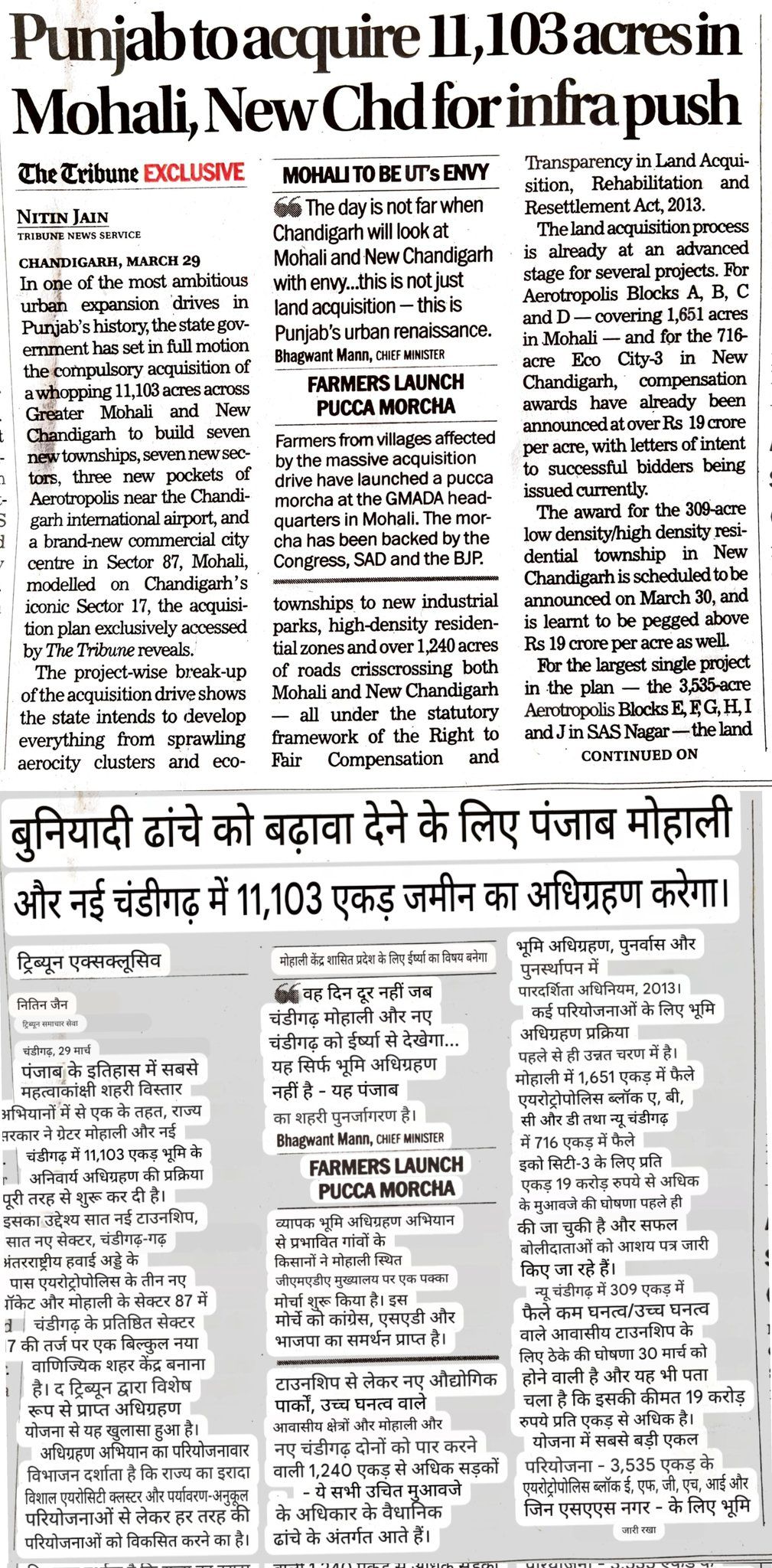 Will acquire 11,103 Acres in Mohali , New Chd for Infrastructure Push.