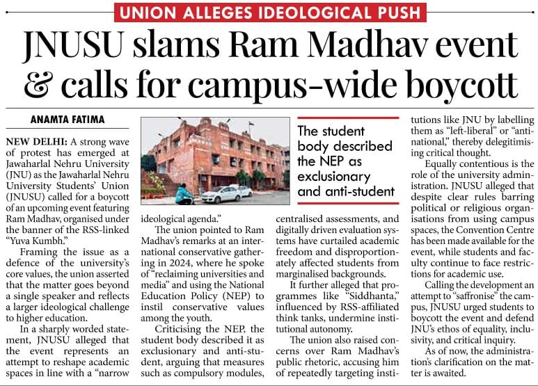 JNU Students' Union alleges ideological push under the banner of the RSS-linked "Yuva Kumbnh", and slams Ram Madhav event and calls for campus-wide boycott.