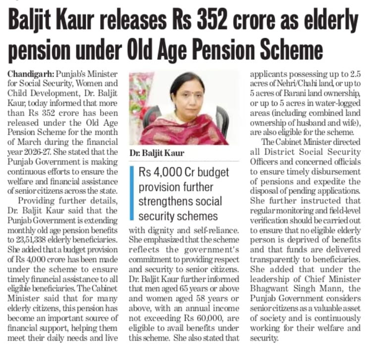 Baljit Kaur releases ₹352 crore as elderly pensiion under the Old Age Pension Scheme.