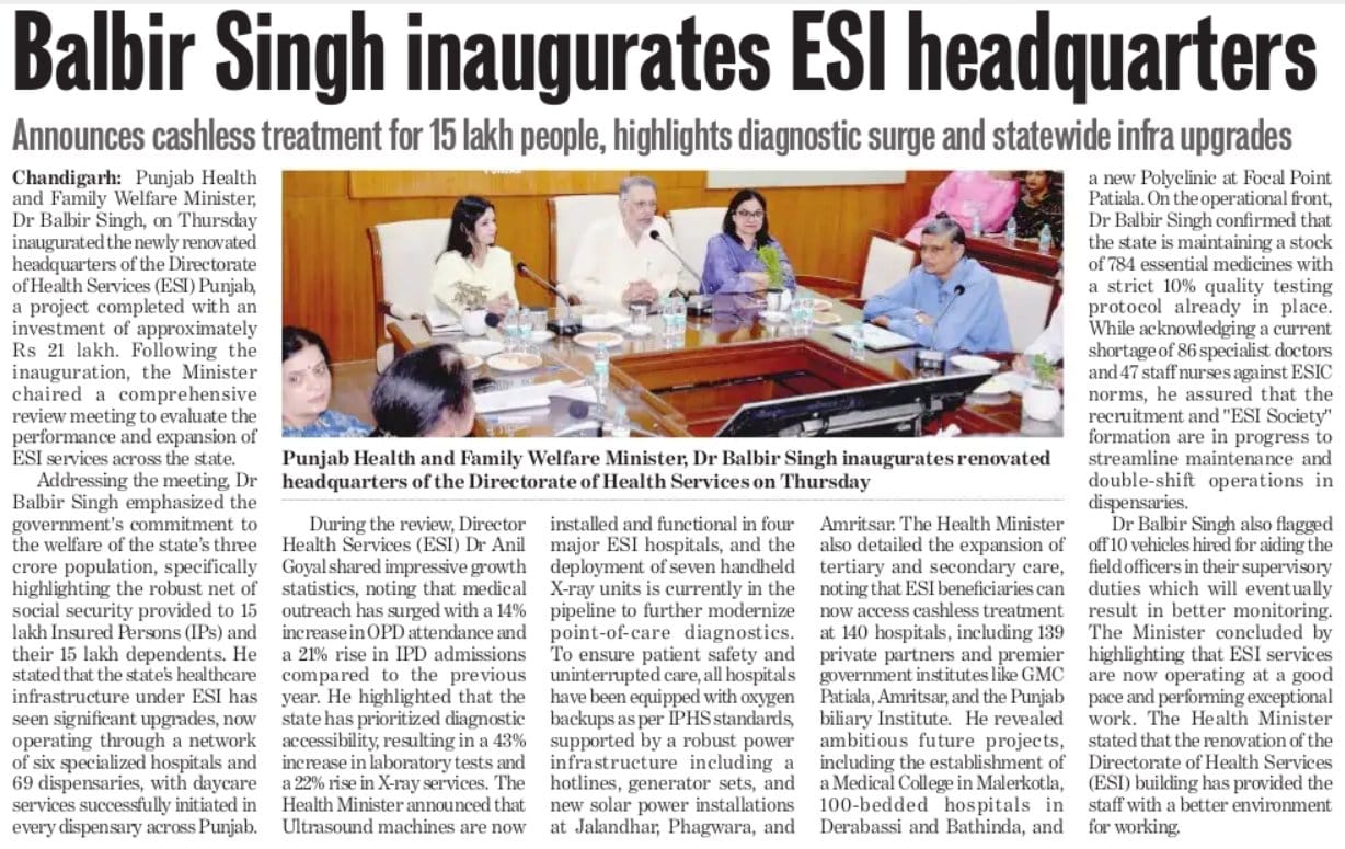 Punjab Minister Balbir Singh inaugurates ESI headquarters - It is a robust net of social security provided to 15 lakh insured persons and their dependents.