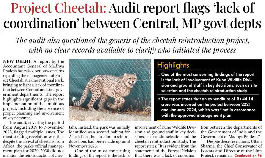 Project Cheetah: The audit flags multiple issues No clear records are available to clarify who initiated the process Lack of coordination between the Central and MP government departments. Expenditure is not following the approved management plan