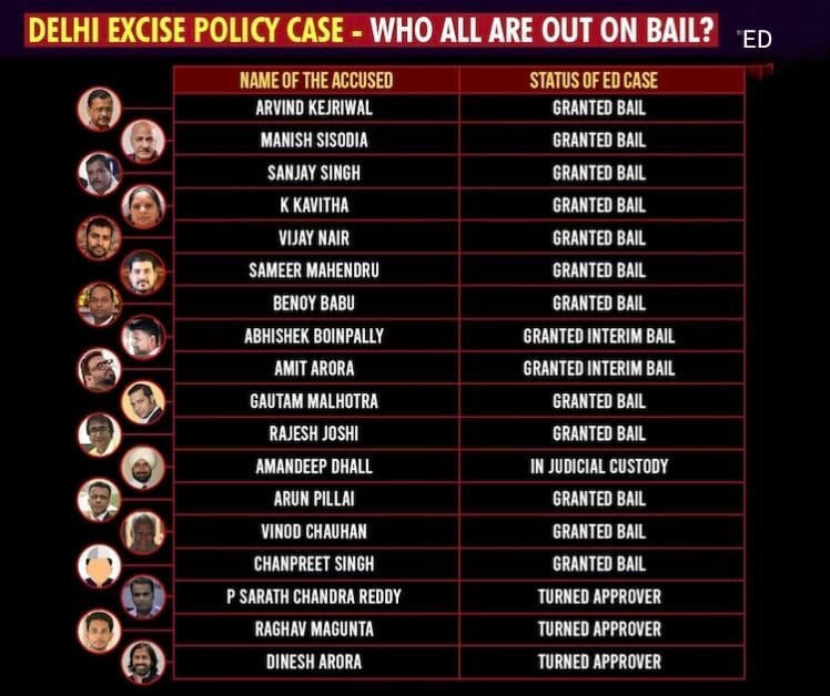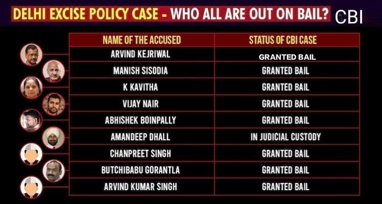 8 people granted regular Bail Only businessman Amandeep Dhall remain in custody. Arvind Kejriwal, Manish Sisodia, BRS leader K Kavitha, Vijay Nair, Abhishek Boinpally, Hyderabad CA Butchibabu Gorantla, news channel head Arvind Kumar Singh, and AAP volunteer Chanpreet Singh have been granted bail.