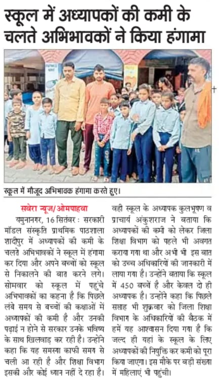 Due to the shortage of teachers in the Government Model Sanskriti Primary School Shadipur (Yamunanagar, Haryana), the parents created a ruckus in the school and threatened to take their children out of the school