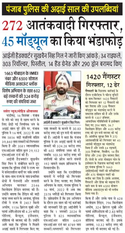 Achievements of Punjab Police in the past two and a half years: - 272 terrorists have been arrested - 45 modules have been busted - 34 rifles, 303 revolvers, pistols, 14 hand grenades, and 290 drones have been recovered IMEI numbers of 1663 mobiles and 6500 social media accounts have been blocked - Properties worth Rs 324 crore of 602 major smugglers have been seized under a special operation - 1420 gangsters have been arrested, and 12 have been killed