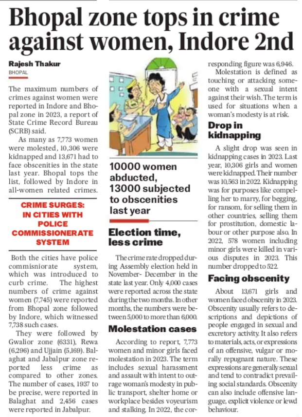 Bhopal zone tops in crime against women, Indore 2nd 10000 women abducted, 13000 subjected to obscenities last yea