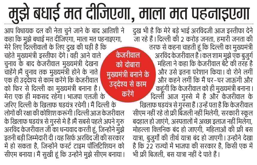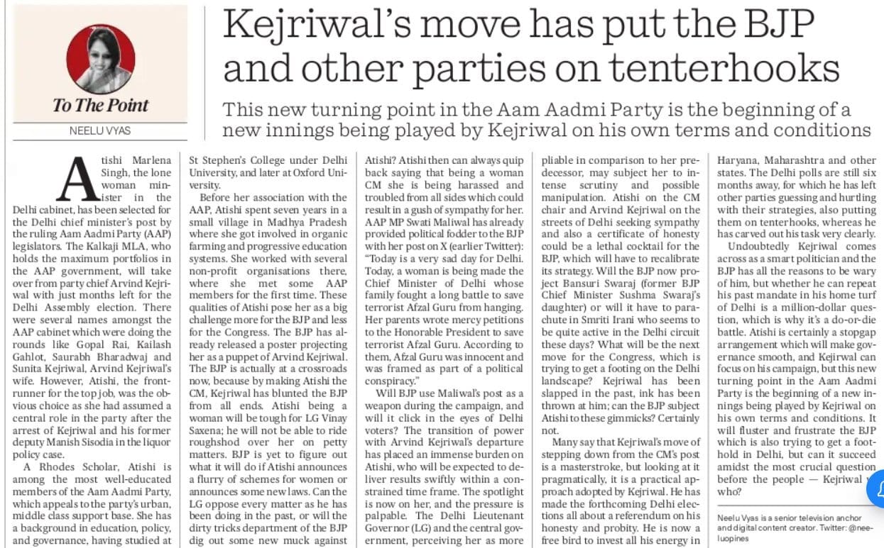"The BJP is actually at a crossroads now, because by making Atishi the CM, Kejriwal has blunted the BJP from all ends. Atishi being a woman will be tough for LG Vinay Saxena; he will not be able to ride roughshod over her on petty matters."