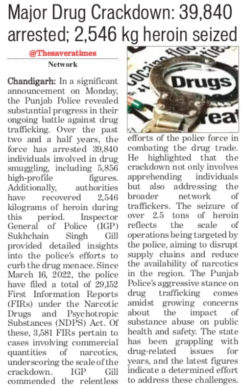 The Punjab Police, over the past two and a half years, arrested 39,840 individuals involved in drug smuggling, including 5,856 high-profile figures. 2,546 kg of heroin was seized.