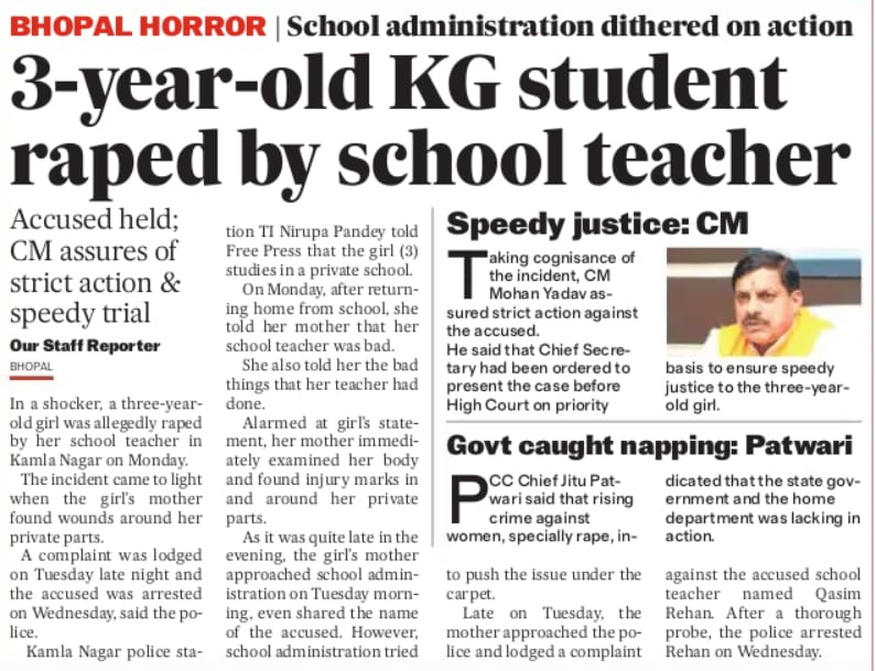 Bhopal Horror: School administration dithered on the action - 3-year-old KG student raped by a school teacher!