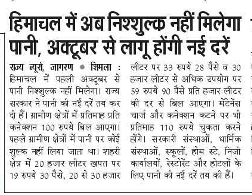 Free water scheme in Himachal हिमाचल में अब निश्शुल्क नहीं मिलेगा पानी, अक्टूबर से लागू होंगी नई दरें