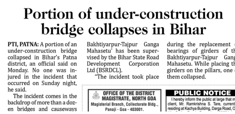 A portion of an under-construction bridge, connecting National Highway 28 in Samastipur and NH 31 in Patna, collapsed in Bihar's Patna district