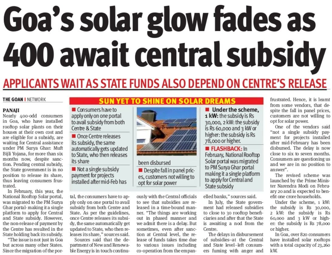 Goa's solar glow fades as 400 await central subsidy under PM Surya Ghar Yojna