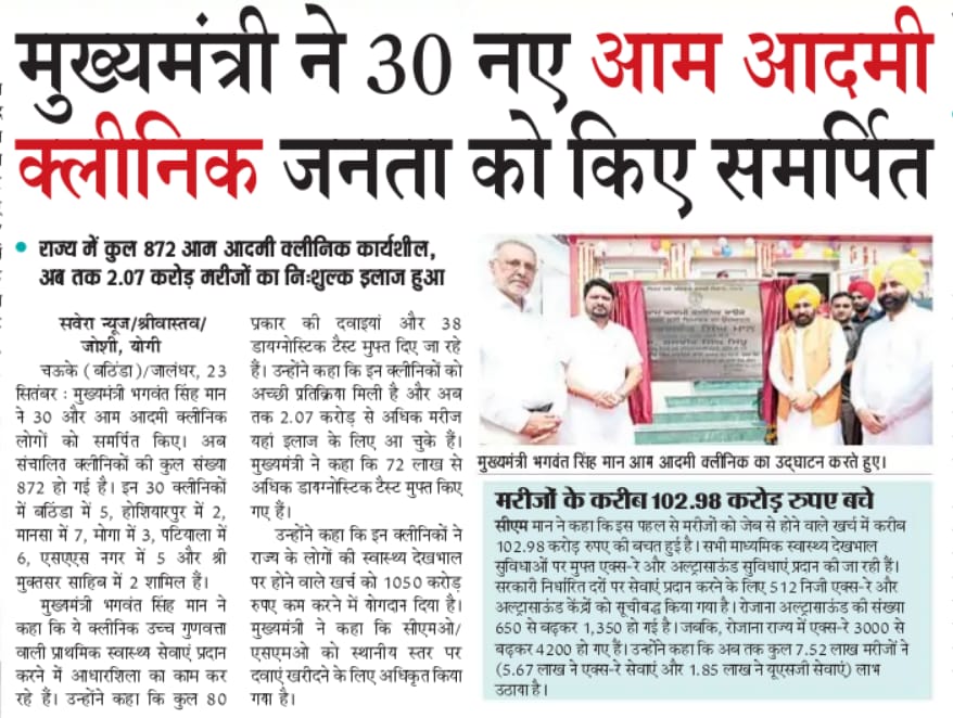 Chief Minister Mann dedicated 30 new Aam Aadmi Clinics to the public The total number of operational clinics has now reached 872. These 30 clinics include 5 in Bathinda, 2 in Hoshiarpur, 7 in Mansa, 3 in Moga, 6 in Patiala, 5 in SAS Nagar and 2 in Sri Muktsar Sahib.