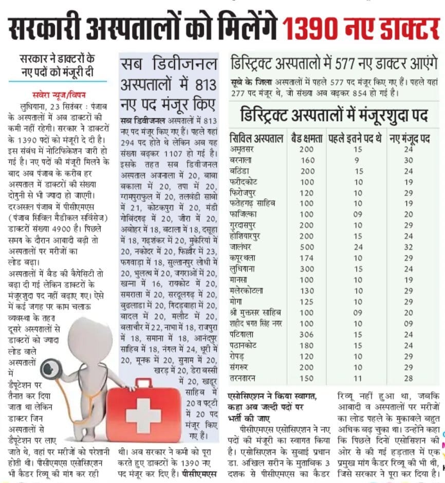 Punjab: Government hospitals will get 1390 new doctors - The government has approved new posts for doctors 813 new posts have been approved in sub-divisional hospitals 577 new doctors will be appointed in district hospitals