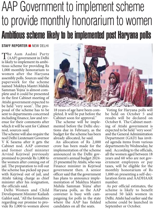 AAP government to implement the scheme to provide the monthly honorarium to women — The ambitious scheme is likely to be implemented post Haryana polls