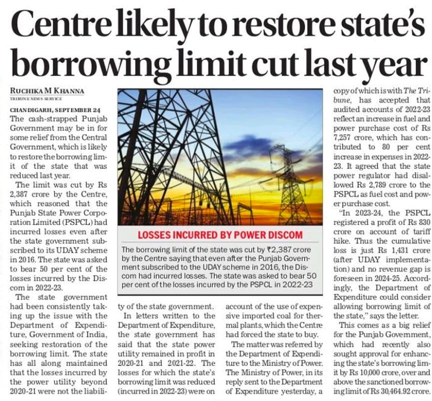 The limit was cut by Rs 2,387 crore by the Centre, which reasoned that the Punjab State Power Corporation Limited (PSPCL) had incurred losses even after the state government subscribed to its UDAY scheme in 2016. The state was asked to bear 50 per cent of the losses incurred by the Discom in 2022-23.