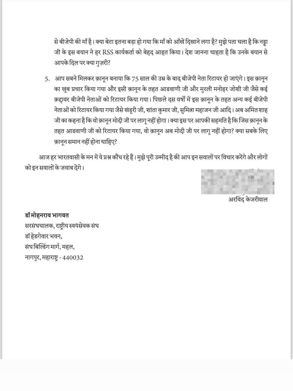 Arvind Kejriwal writes to RSS chief Mohan Bhagwat, raising 5 tough questions: Why doesn't the 75-year retirement rule apply to Modi ji like it did for Advani ji? How does the RSS view Modi ji forming a govt with a leader he accused of a ₹70,000 crore scam? Is using ED-CBI for dishonest power acceptable to the RSS? He adds: 'These questions are on every Indian's mind. It's our duty to uphold the honor of the tricolor.