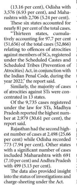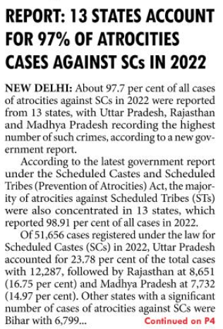 About 97.7% of atrocities against SCs in 2022 were reported from 13 states with UP, Rajasthan and MP recording the highest number of such crimes.