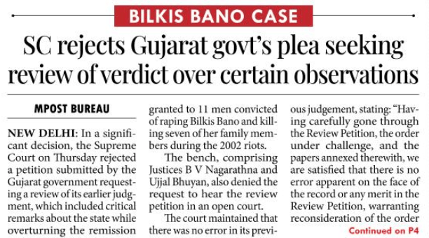 Bilkis Bano case: SC rejects Gujarat govt's review plea seeking adverse comments to be dropped. The SC verdict held that the Gujarat government had usurped the powers of the Maharashtra government acting in furtherance of the judgement of May 13, 2022, in the case.