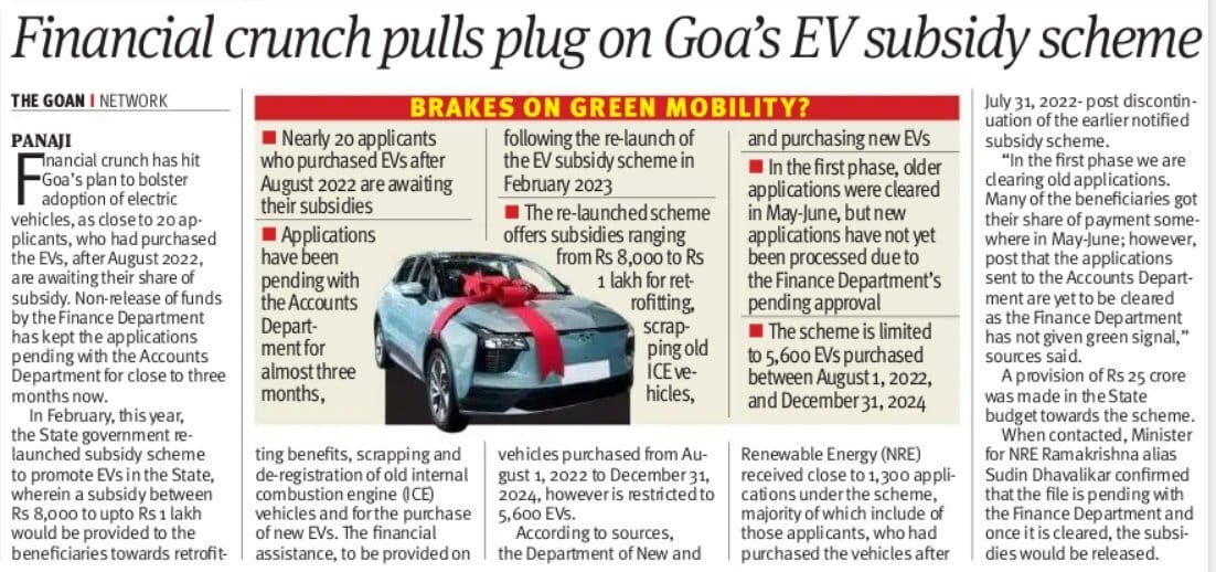 Goa: Break on Green Mobility! Nearly 20 applicants who purchased EVs after August 2022 are still awaiting their subsidies!