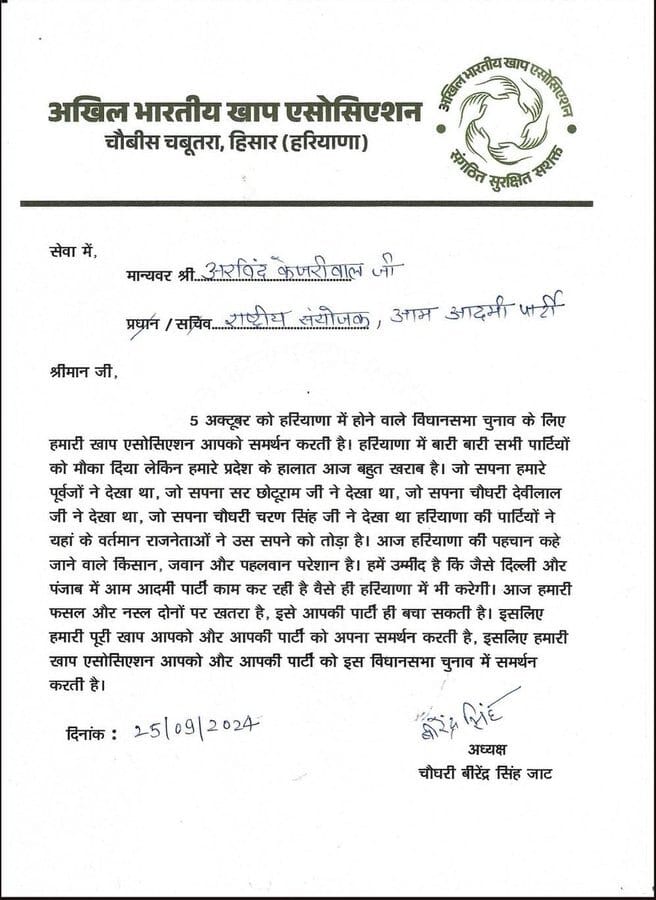 All India Khap Association has given support to Aam Aadmi Party and Arvind Kejriwal for the upcoming assembly elections.