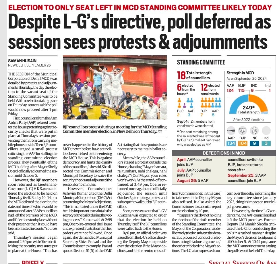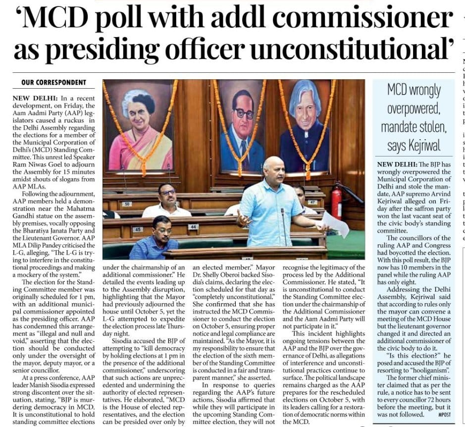 Election of the sixth member of the standing committee in Delhi Municipal Corporation. Mayor Shelly Oberoi wrote a letter to the MCD commissioner. Citing the rules, she gave instructions to conduct the elections on the scheduled date of 5 October.