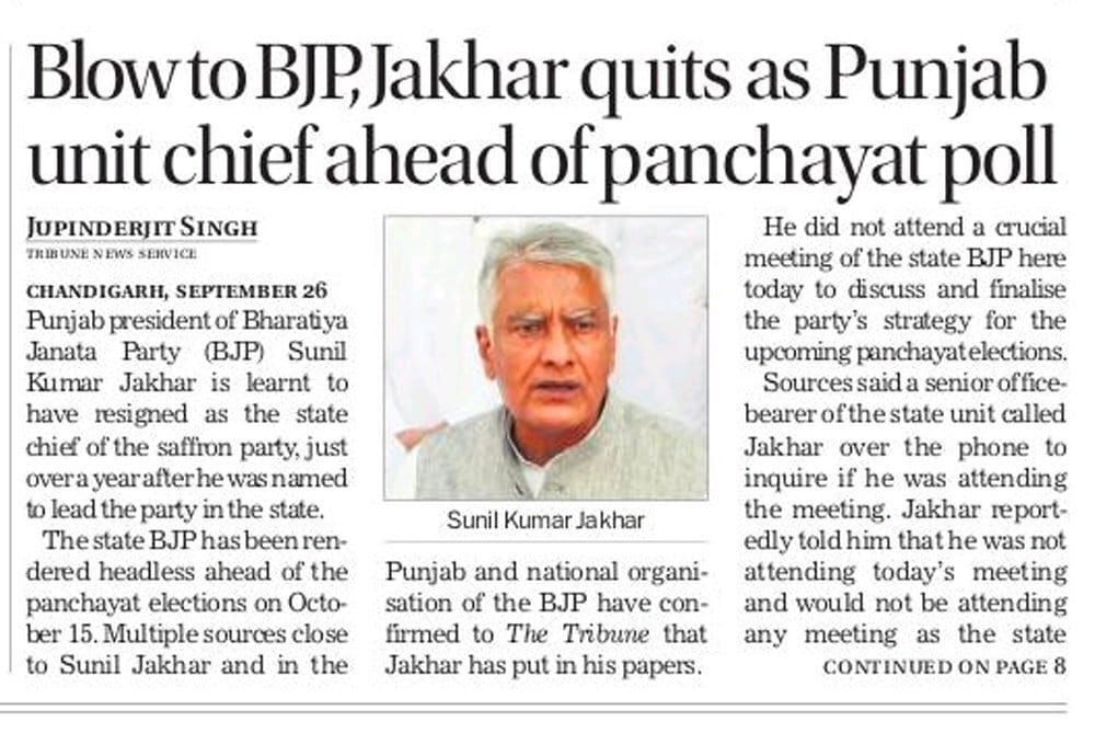 Blow to BJP, Jakhar quits as Punjab unit chief ahead of panchayat poll