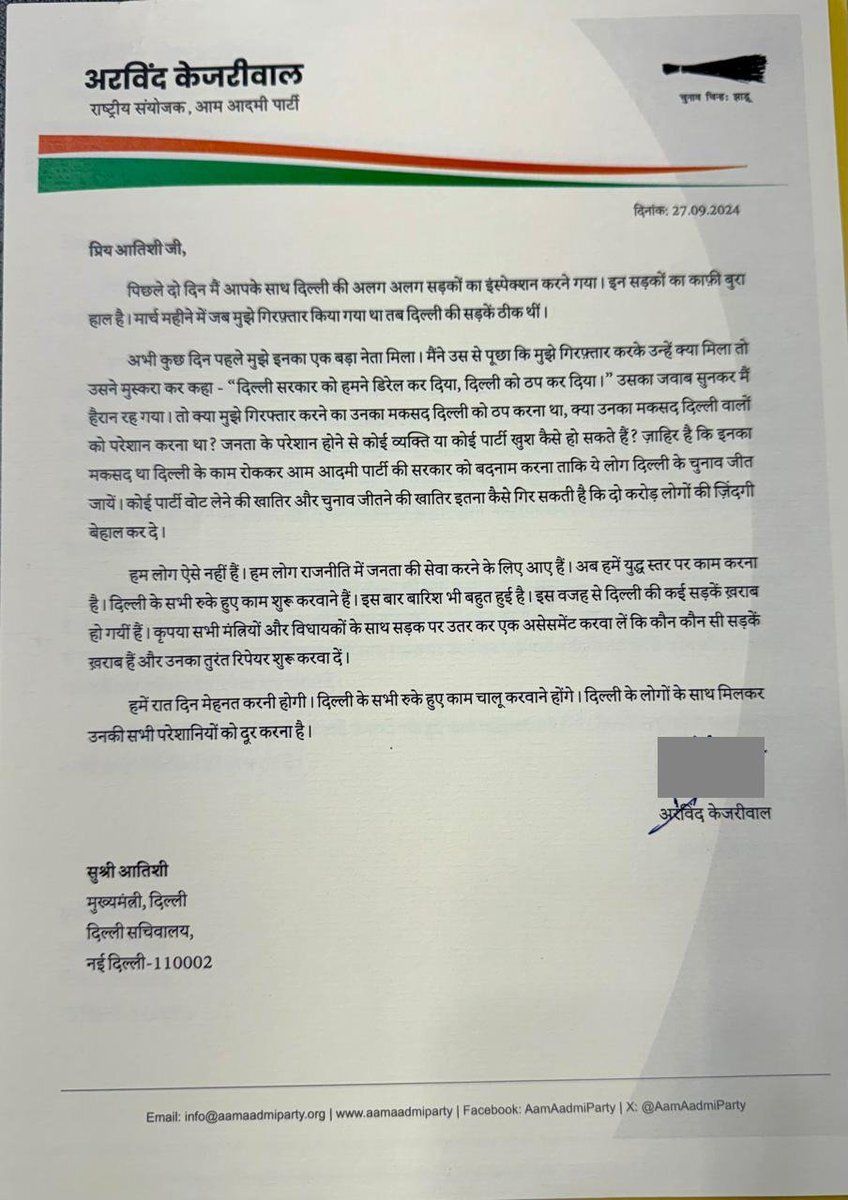 Aam Aadmi Party's National Convenor @ArvindKejriwal today wrote a letter to Delhi Chief Minister @AtishiAAP to take MLAs along and get the broken roads in Delhi repaired on a war footing.