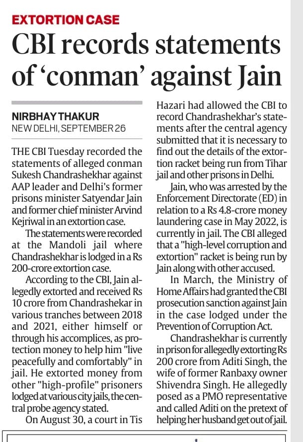 EXTORTION CASE CBI records statements of 'conman' Sukesh against Satyendra Jain