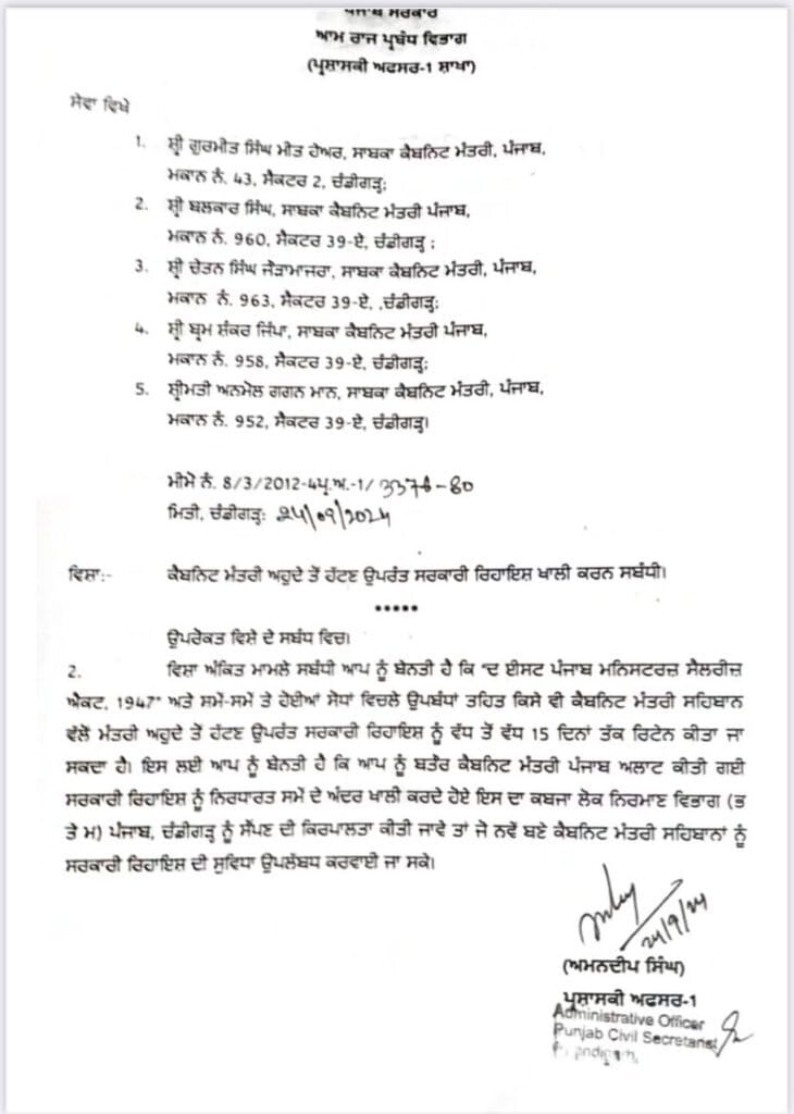 Punjab government has issued notices to former cabinet ministers to vacate their official government residences after being dropped from the cabinet. They have been given 15 days to comply. The ministers include Anmol Gagan Mann, Chetan Singh Jouramajra, Brahm Shankar Jimpa, Balkar Singh, and Meet Hayer.
