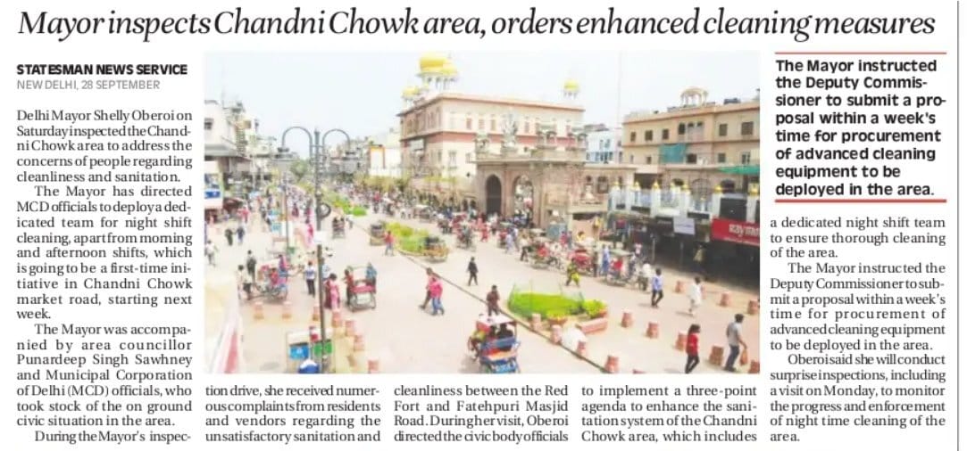 Mayor ihspects Chandni Chowk area, orders enhanced cleaning measures. Instructs the Deputy Commissioner to submit a proposal within a week
