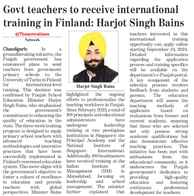 The Punjab Government has decided to send 72 government primary school teachers to the University of Turku in Finland for a three-week international training program.